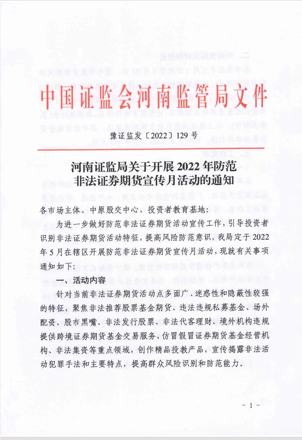 河南證監(jiān)局關(guān)于開(kāi)展2022年防范非法證劵期貨宣傳月活動(dòng)的通知